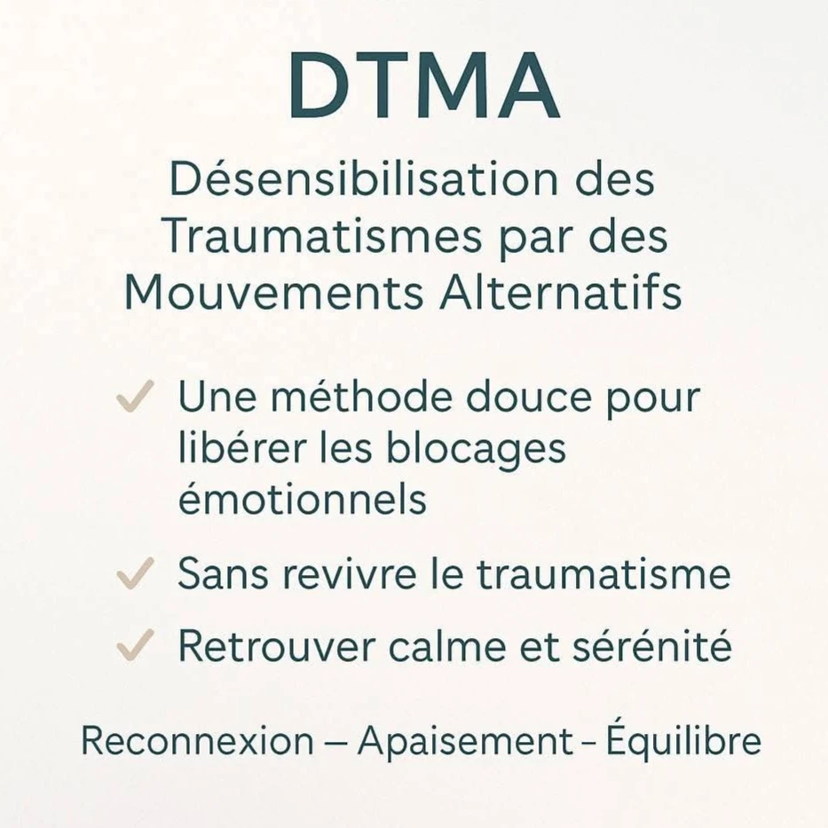 -La DTMA (Désensibilisation des Traumatismes par les Mouvements Alternatifs) est un outil qui sert à traiter, à désensibiliser un traumatisme par des mouvements alternatifs sur les genoux et par des sons près des oreilles. La DTMA est un merveilleux outil au pouvoir libérateur, très efficace et très rapide même si le traumatisme est ancien.