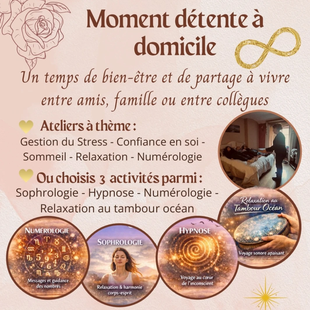 Je propose également des ateliers thématiques en groupe collectif (gestion du sommeil, confiance en soi, gestion du stress, relaxation, numérologie…), des relaxations au Tambour Océan, ainsi que des Sophro-ballades avec l’arrivée des beaux jours.